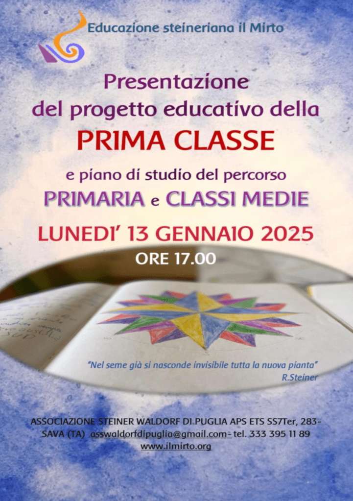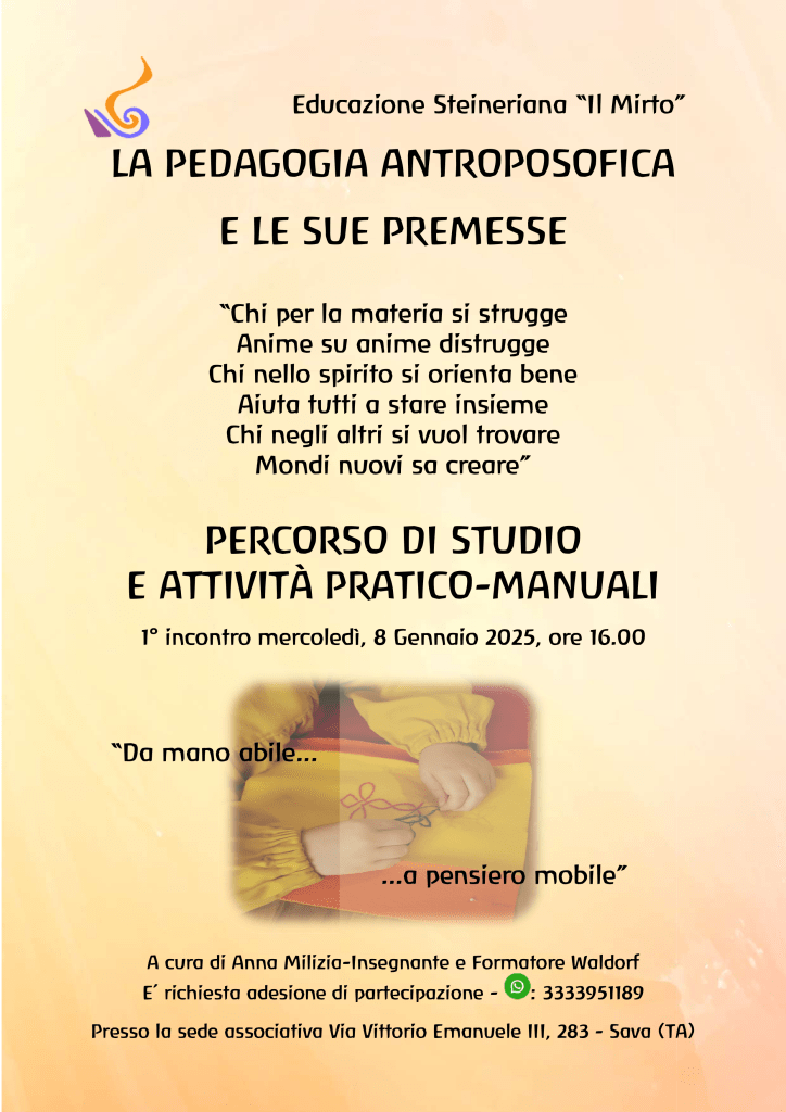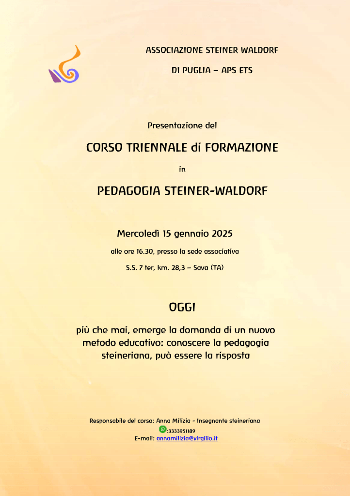 Partecipa alla presentazione del corso di formazione in pedagogia Steiner-Waldorf, in programma sabato 25 ottobre alle ore 16:00 presso la nostra sede di Sava (TA).